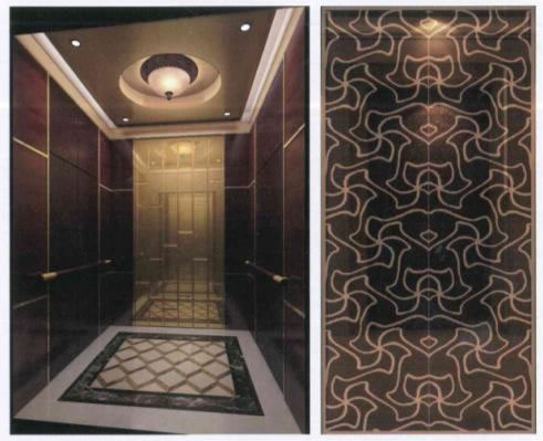 轎壁:后壁中間鈦金車邊鏡兩側(cè)木飾面,側(cè)壁中間皮飾面兩側(cè)木飾面,加金屬線條
